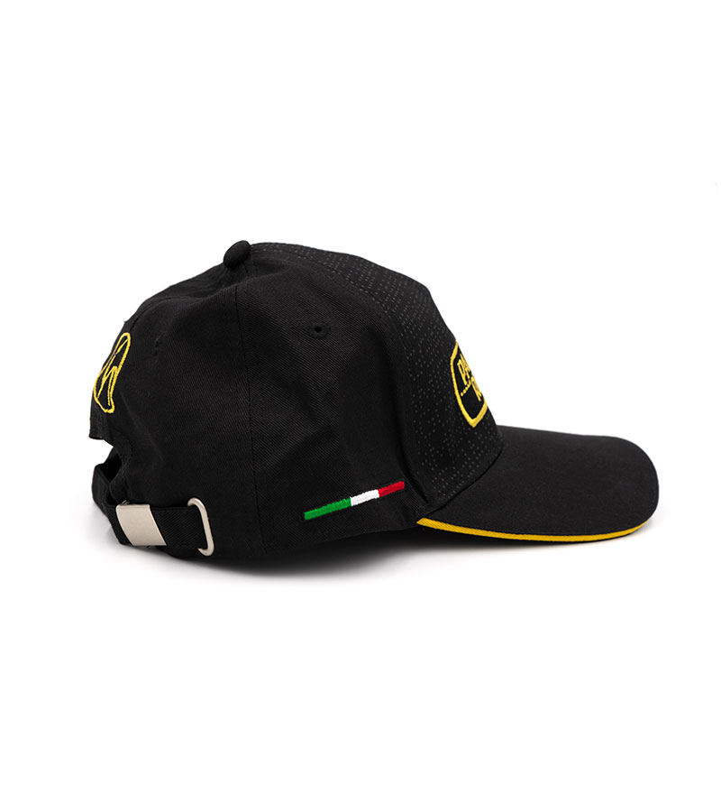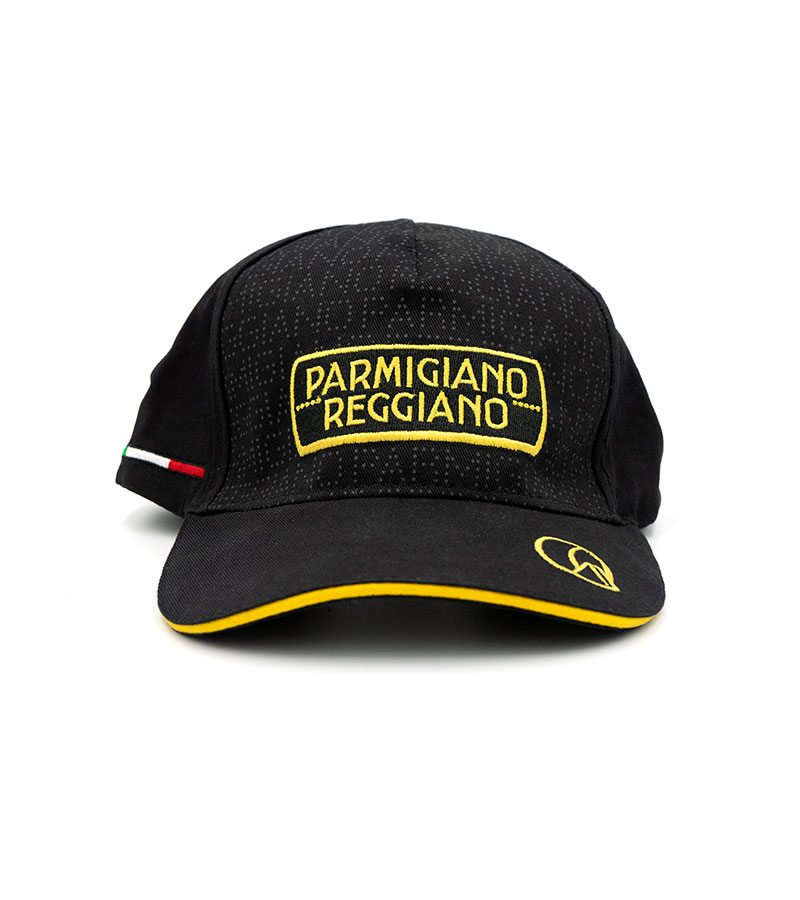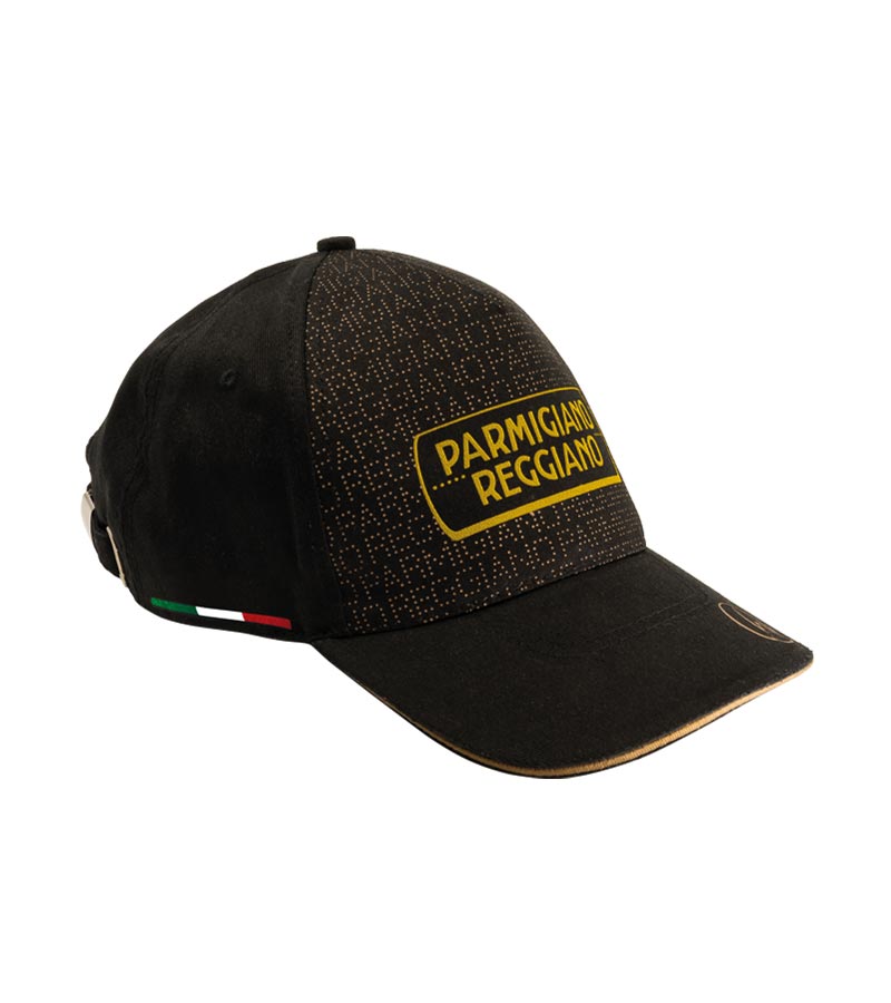 Cappello Nero – Berretto con visiera in cotone nero, con il marchio Parmigiano Reggiano in risalto sulla fronte e bandiera italiana sui lati. Dotato di chiusura regolabile con clip di metallo sul retro.