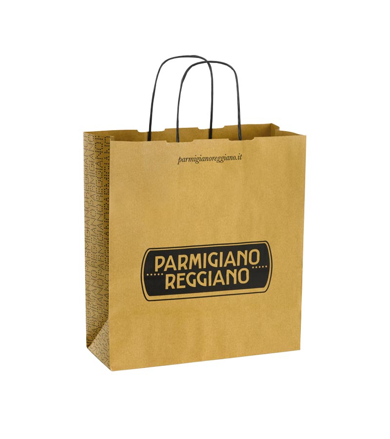 Borsa di carta avana kraft con stampa ad 1 colore del marchio Parmigiano Reggiano. Manico in treccia colore nero.