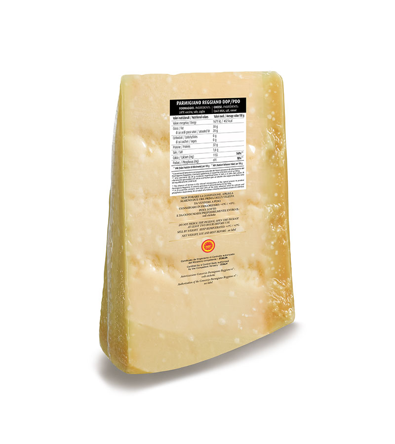 Nel sacchetto sono già stampate tutte le diciture di legge per il confezionamento del Parmigiano Reggiano; per rispettare i termini di legge manca solo la denominazione del confezionatore e il suo numero di Autorizzazione del Consorzio del Parmigiano Reggiano. Questi dati posso essere stampati sulla etichetta della bilancia assieme al peso e alla scadenza.