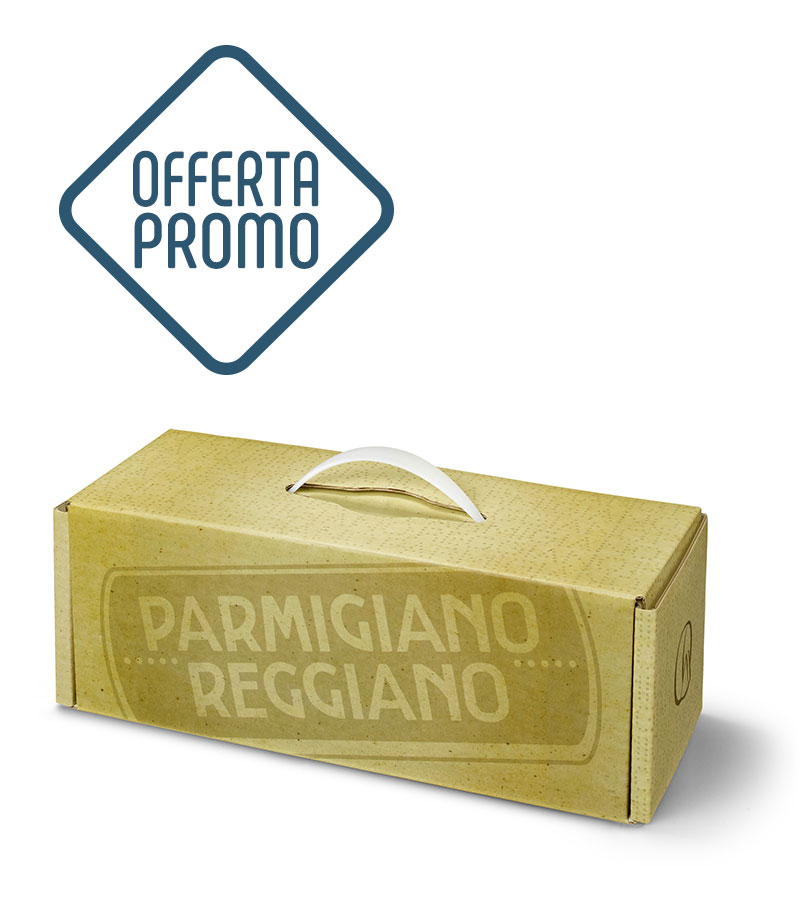 Confezione cartone con maniglia per una o due punte di parmigiano e bottiglia a marchio Parmigiano Reggiano
