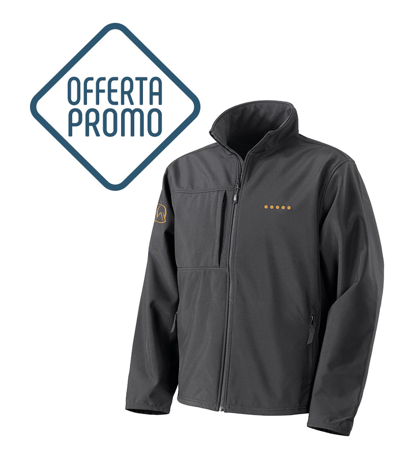 Giacca antivento in poliestere modello “Soft Shell” 300g/m². Resistente all’acqua e a lavaggi multipli. Tasca sul petto alta e due tasche a chiusura sui lati.