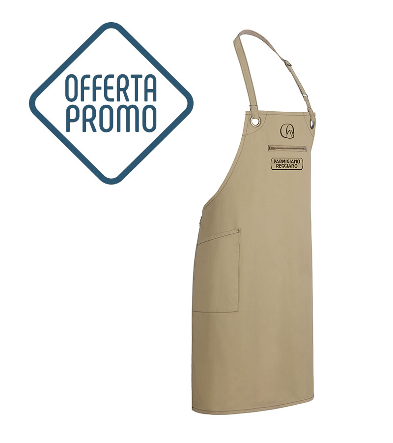 Grembiule in poliestere/cotone color beige, con stampa Parmigiano Reggiano marrone sulla pettorina.