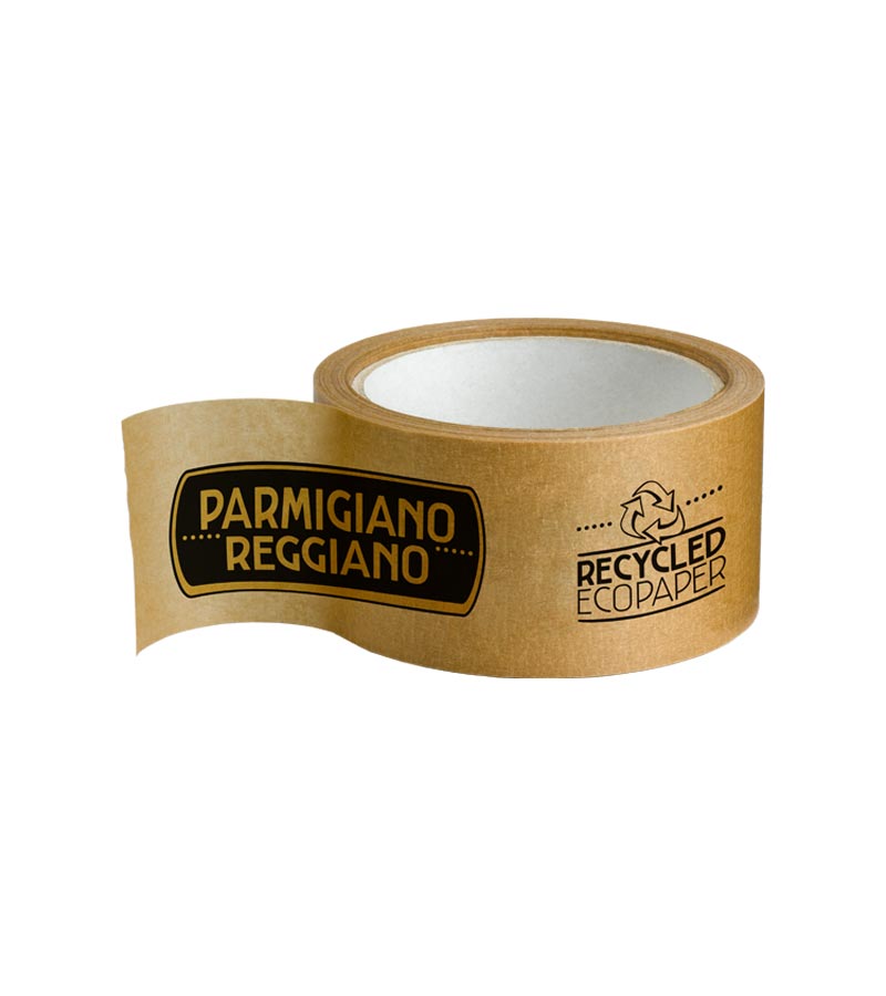 Nastro da pacchi in carta con collante in gomma naturale senza solventi, di colore avana e scritta Parmigiano Reggiano in nero.