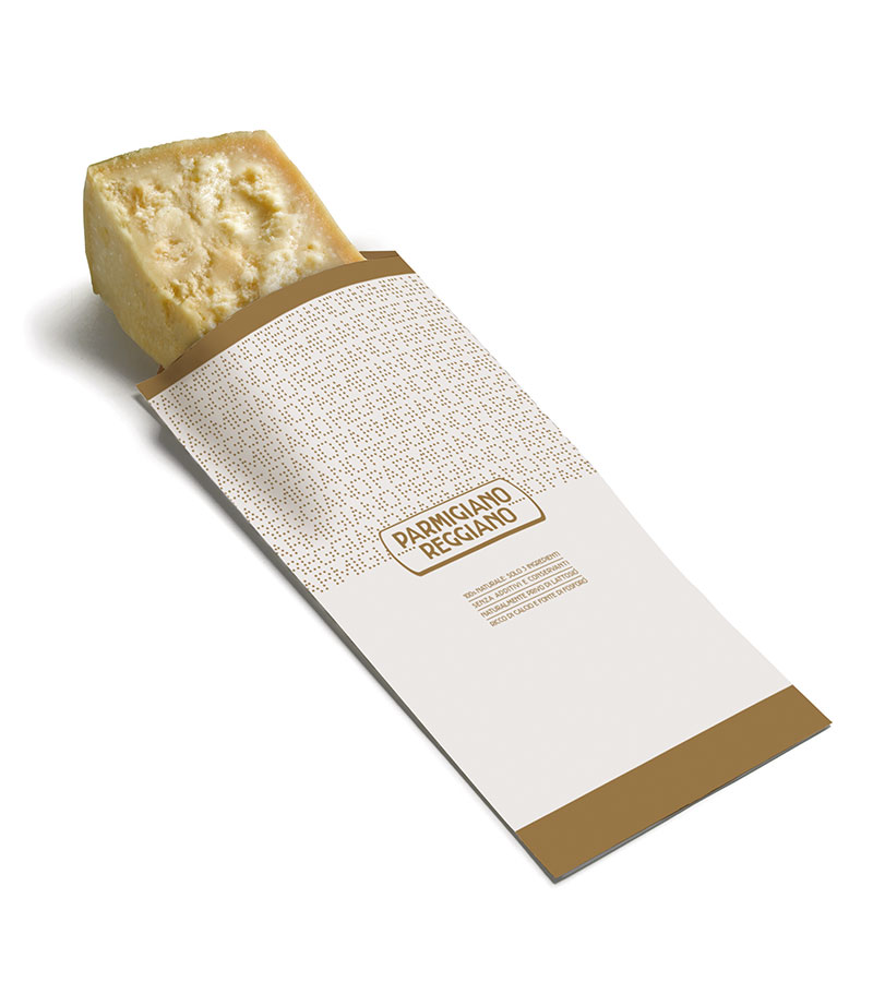 Stampato con logo del Parmigiano Reggiano sul fronte e indicazioni tecniche e nutrizionali sul retro.