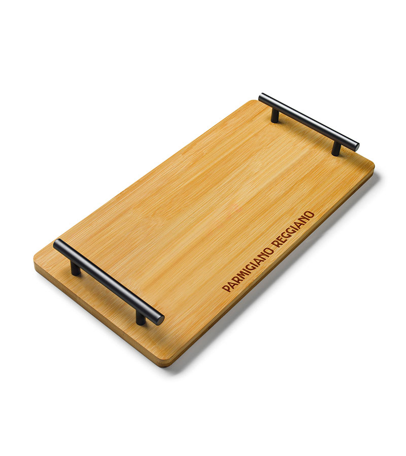 Tagliere in bamboo naturale con manici in acciaio verniciato nero, personalizzato con il marchio Parmigiano Reggiano.